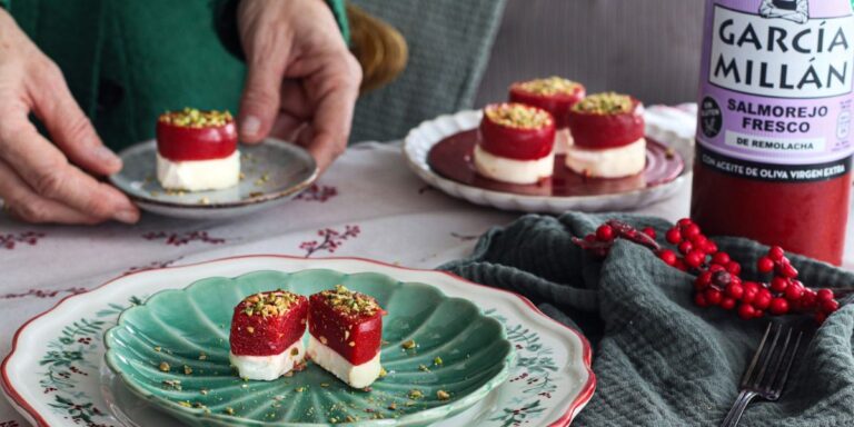 Bombones de Salmorejo de Remolacha sobre Medallones de Queso de CabraLeer más Bombones de Salmorejo de Remolacha sobre Medallones de Queso de Cabra