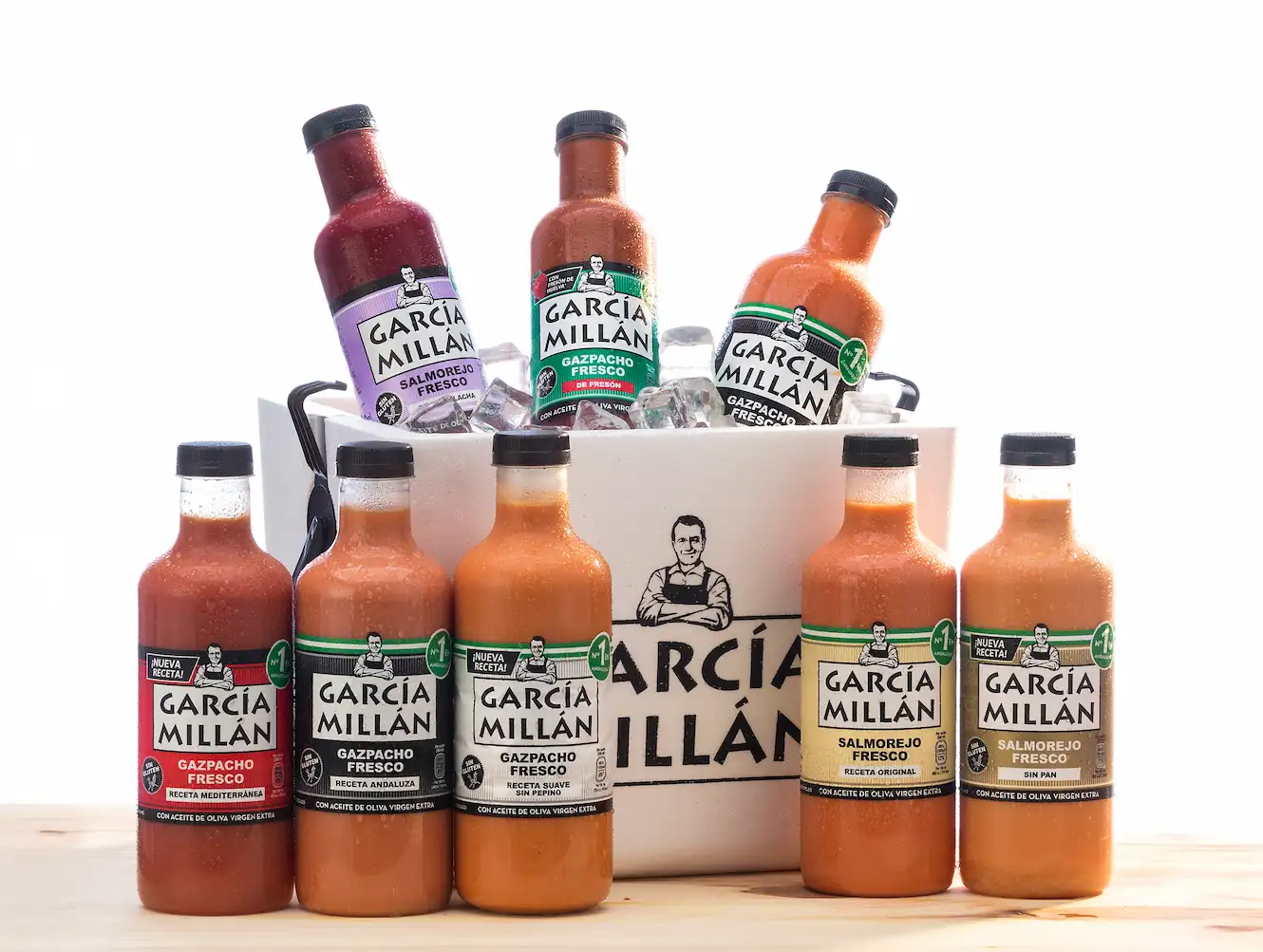Elige tu combinación favorita de gazpachos y salmorejos García Millán en esta nevera de corcho reutilizable, para llevártela a donde quieras. Incluye 8 botellas a tu elección, tus recetas favoritas o descubre los nuevos sabores.